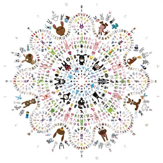 Er is niet zoiets als te veel konijntjes! Pictoplasma vroeg internationaal gevestigde en aankomende karakter ontwerpers, illustratoren en kunstenaars over de hele wereld hun versies van konijnen, konijnen, hazen en alles daar tussenin in te sturen. Het resultaat is een full-scale bunny overdosis, met meer dan 1.500 individuele konijnen door 500+ internationale deelnemers. Door condensatie van de eindeloze variaties van het konijn motief in een ultieme systeem - een perfecte bunny mandala - de ware aard van het beest naar voren: de eeuwige essentie van het konijn. Hang ze allemaal naast elkaar en je krijgt een geweldig behang als installatie kunst.