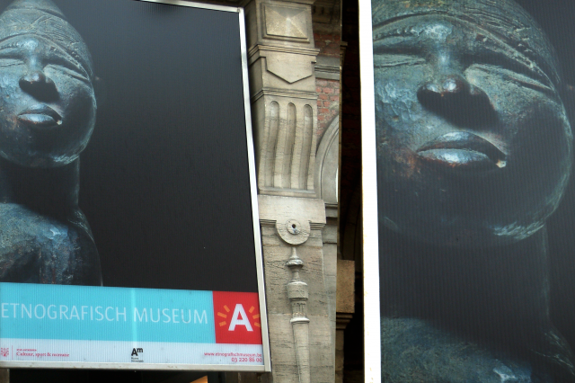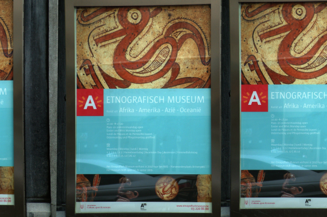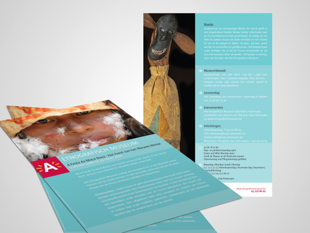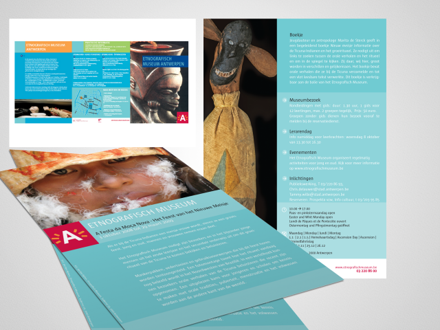 Kiezen welk beeld het uithangbord wordt voor het etnografisch museum en opmaken van templates voor informatieve uithangborden / signalisatie / flyers en brochures in de huisstijlnormen van de stad Antwerpen. De buitenreclame bestaande uit een hoofdpaneel verwijzend naar de collectie en 2 zijpanelen die meer informatief waren. De flyers en brochures werden gebruikt om een tentoonstelling aan te kondigen. Campagnewerk moet hier dan ook niet in de letterlijke zin worden opgevat, als een tijdelijke actie om het cliƫnteel te verleiden, maar eerder de bekendheid ter ore brengen, de eigen gevel is al een punt waaruit men kan vertrekken, zeker op een drukbezochte plaats met veel passanten als de Suikerrui in Antwerpen.