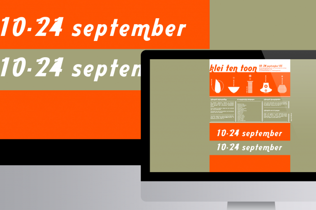 Campagnebeeld en promotiecampagne voor klei ten toon een tentoonstelling over keramiek. Het campagnebeeld bestond uit sterk grafisch uitgewerkte iconen met herkenbaarheid. Het campagne beeld werd telkens herhaald op meerdere media om mensen te informeren: site/ affiches 50*70cm/ flyers en uitnodigingen. Het concept ‘klei ten toon’ en copywriting is volledig ontwikkeld door mij. Tijdens de opmaak is rekening gehouden met drukkosten, druk in één kleur maar ook geen plaatwissel omdat de uitnodigingen de affiche doubleert en konden versneden worden op postkaartformaat.
