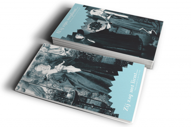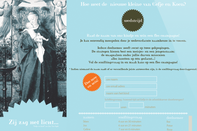 De beelden die gebruikt zijn refereren naar het werk van Jan Van Eyck 'moeder en kind' en 'portret van Giovanni Arnolfini en zijn vrouw'. Het thema waar onder gewerkt werd was voor de trouwkaart: 'wij zijn verplicht' en voor de geboortekaart: 'zij zag het licht';