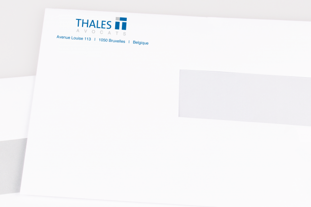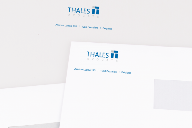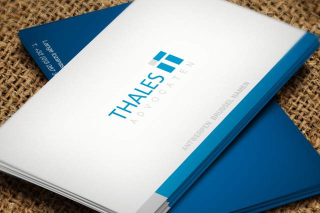Thales advocatenbureau met drie vestingen in België, met een duidelijke expertise in ondernemingsrecht, handelsrecht en economisch recht, kwam met de vraag om de vorige huisstijl om te vormen naar een uniformere stijl, zonder afbreuk te doen aan de toenmalige vormgeving. Thales had al een merkimago opgebouwd, maar was niet meer tevreden over de uitstraling. Het logo van Thales werd sterk vereenvoudigd met oog voor een zakelijke uitstraling. De kleuren werden opgefrist, een dof blauw werd vervangen door een helder blauw en een neutraal grijs. Voor Thales is een eenvoudige online huisstijlgids ontwikkeld met duidelijke richtlijnen betreffende de (druk)kleuren CMYK, RGB en Pantone. De lettertypes werden bepaald in functie van gebruik en er werden sjablonen opgemaakt in drukklare bestandtypes voor de naamkaartjes, briefhoofden, volgbriefpapier, ruitjespapier, omslagen, logo’s in het Frans, Nederlands en Engels die eenvoudig te downloaden zijn.